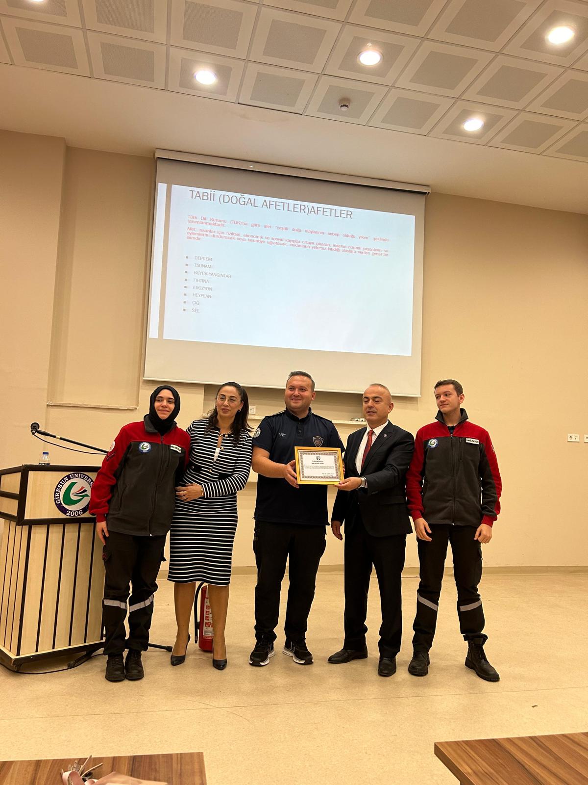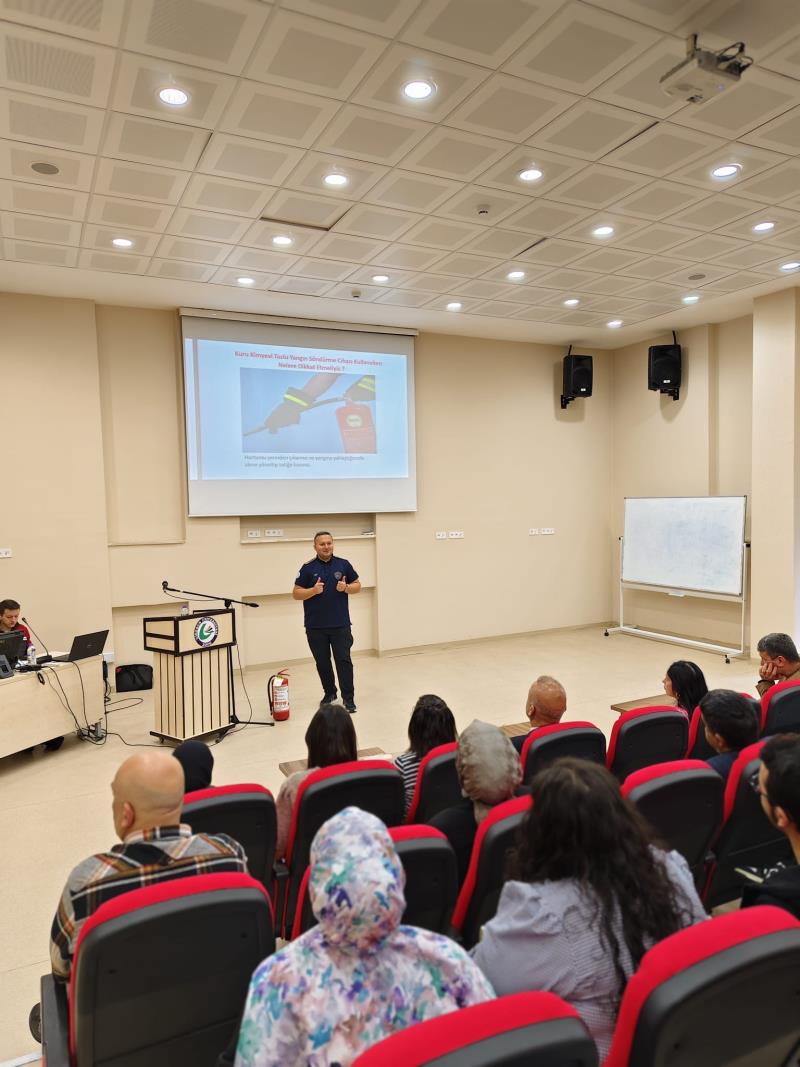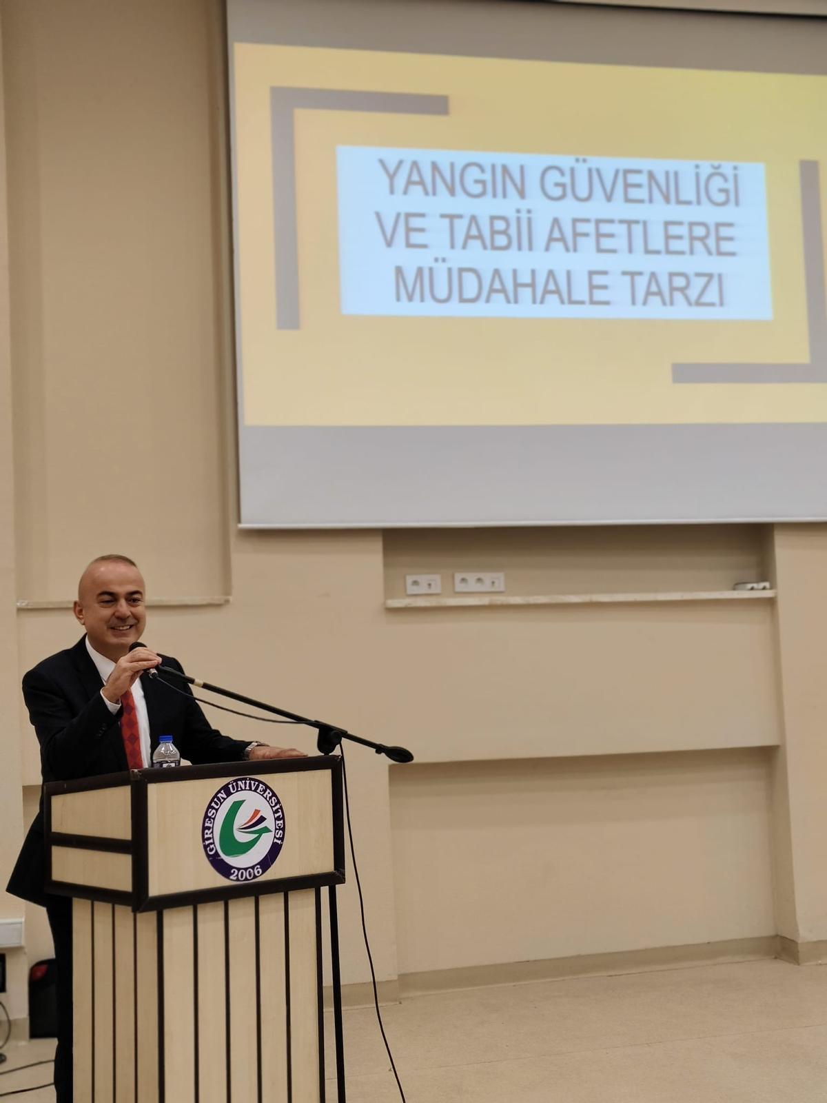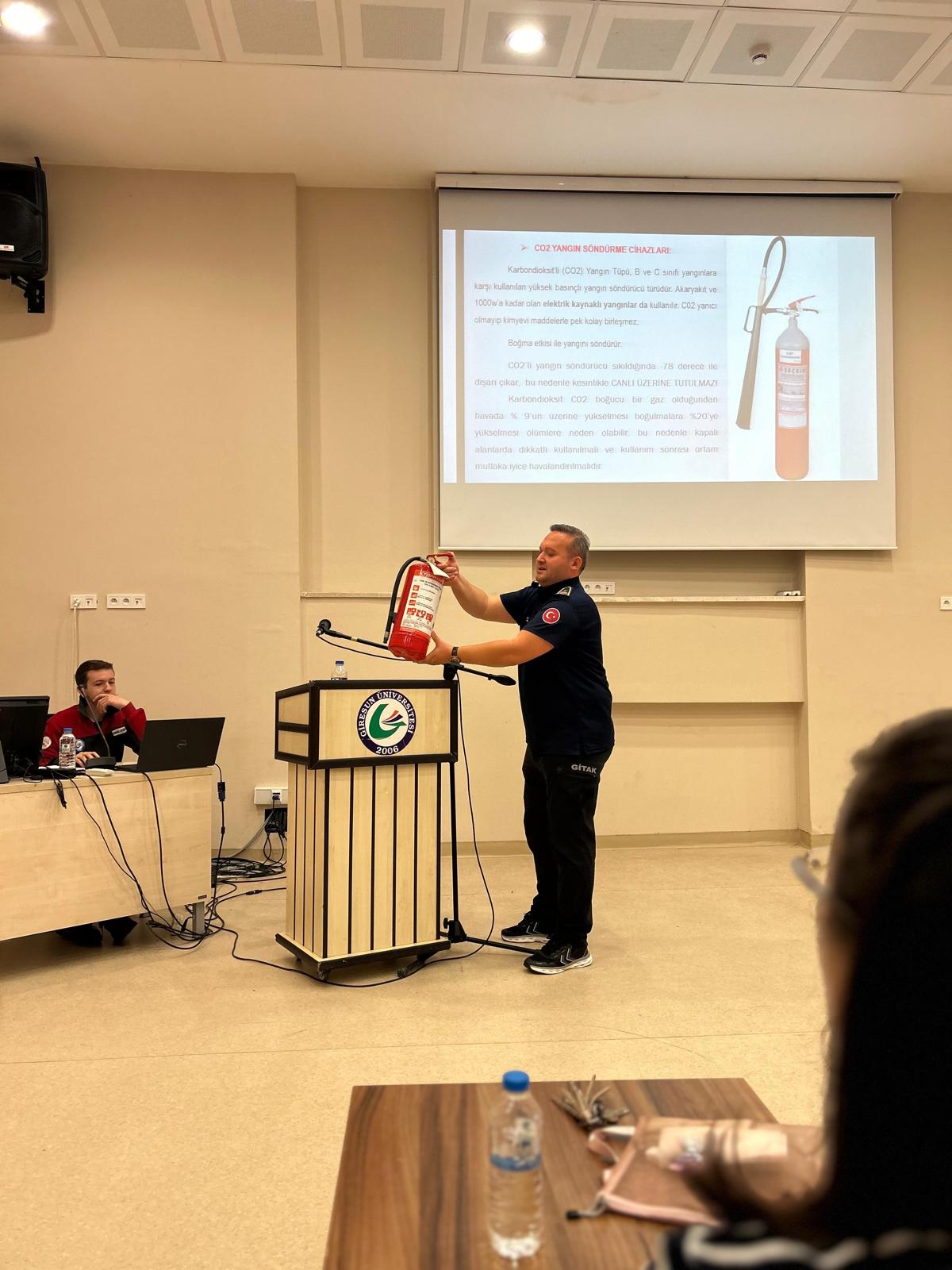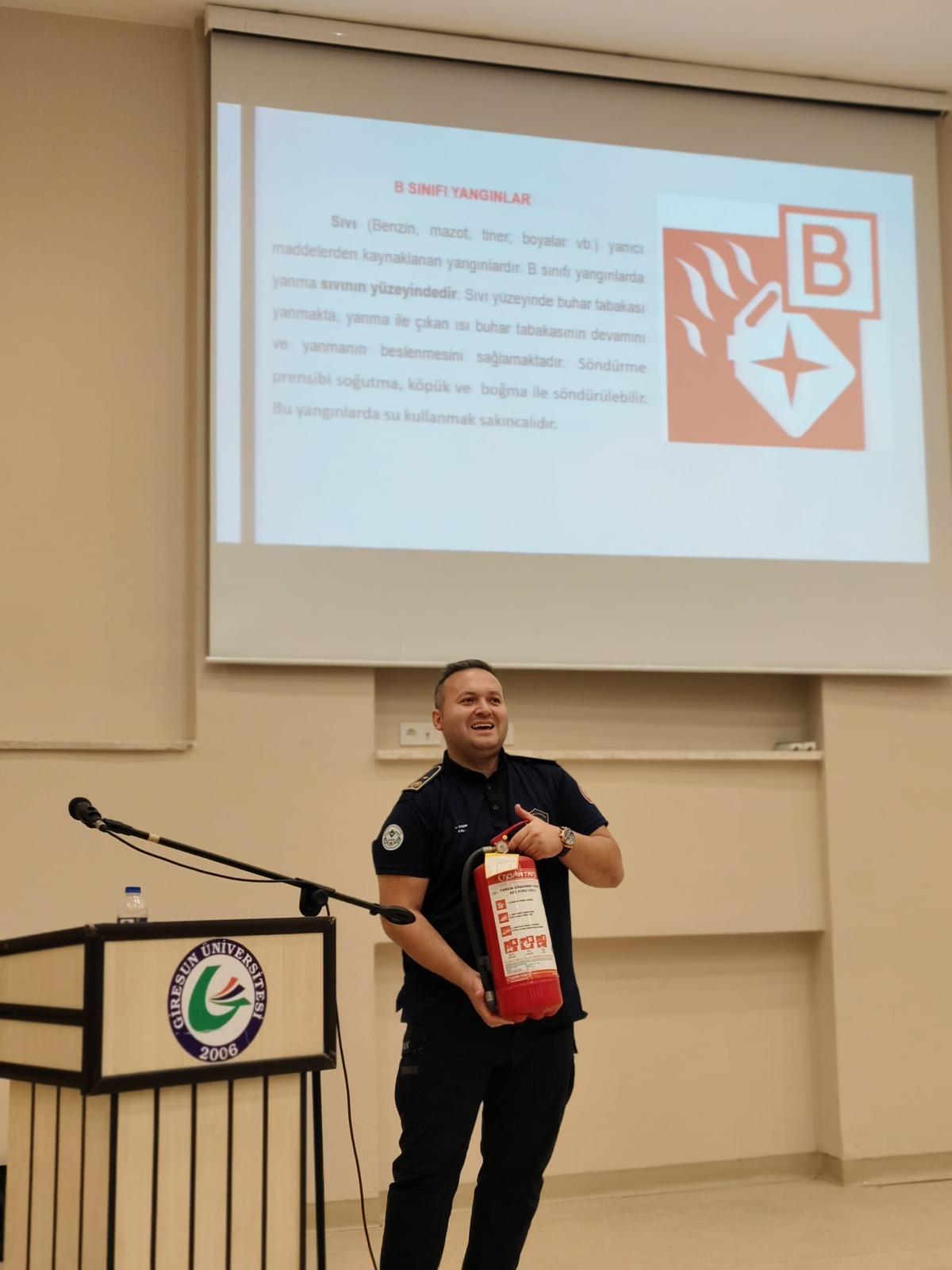 Bölüm Başkanlığımız tarafından geleneksel hale getirilen “İlk ve Acil Yardım Etkinliklerinin” bu yıl dördüncüsü öğretim elemanlarımız ve öğrencilerimizin yoğun katılımlarıyla gerçekleştirilmiştir. Etkinliğimize Fen Edebiyat Fakültesi Dekanı Sayın Prof. Dr. Beyhan KESİK ve Fakülte Sekreteri Sayın Erol CAN’da katılmışlardır. Etkinlik kapsamında Giresun Belediyesi İtfaiye Müdürlüğünde İtfaiye Amiri olarak görev yapan Sayın Adnan AYDIN “Yangın Güvenliği ve Tabii Afetlere Müdahale Tarzı” başlıklı sunumunu gerçekleştirerek, yangın, yangınları önlemek ve yangın durumunda yapılması gerekenler hakkında ayrıntılı bilgiler vermiş, ayrıca öğrencilerimiz ve öğretim elemanlarımızın da konu ile ilgili sorularını cevaplandırmıştır.