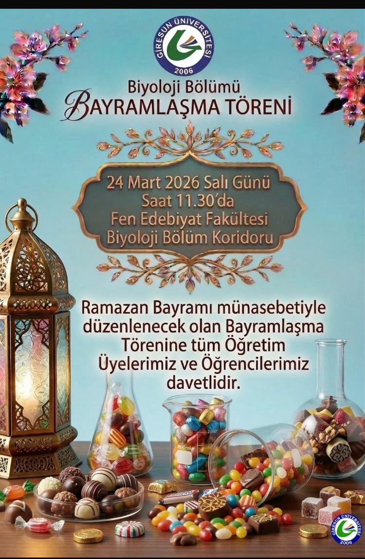 Fen Edebiyat Fakültesi Biyoloji Bölümü ailesi olarak, Ramazan Bayramı’nın manevi coşkusunu ve birleştirici ruhunu hep birlikte yaşadık. 24 Mart 2026 Salı günü saat 11.30’da Biyoloji Bölümü koridorunda düzenlenen bayramlaşma törenine; bölüm başkanımız, öğretim üyelerimiz ve kıymetli öğrencilerimiz yoğun katılım gösterdi.